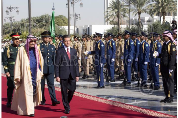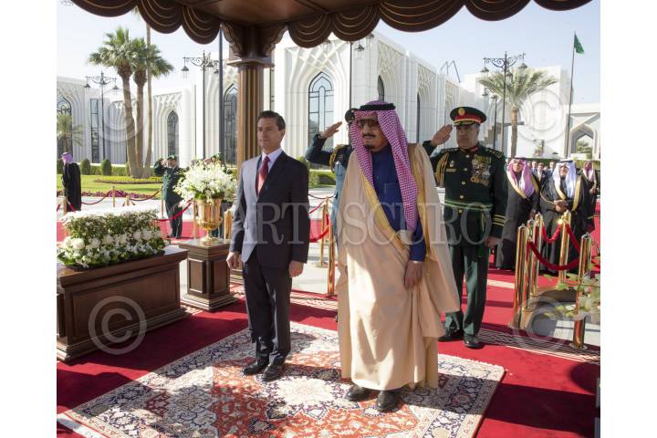 RIAD, ARABIA SAUDITA, 17ENERO2016.- El Presidente de la República, México Enrique Peña Nieto, durante la Ceremonia Oficial de Bienvenida, que le ofreció el Custodio de las Dos Santas Mezquitas Rey Salman Bin Abdulaziz Al-Saud, Rey de Arabia Saudita, en la Explanada del Palacio de la Corte Real. Durante la ceremonia se entonaron los himnos nacionales de ambos países, el Mandatario mexicano pasó Revista a la Guardia de Honor y posteriormente fue la presentación de Comitivas Oficiales. FOTO: PRESIDENCIA /CUARTOSCURO.COM