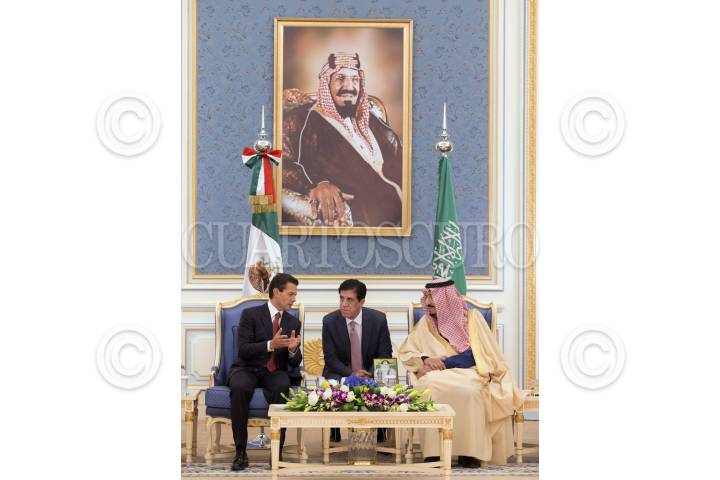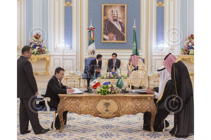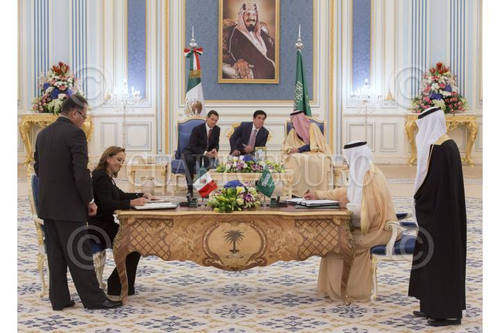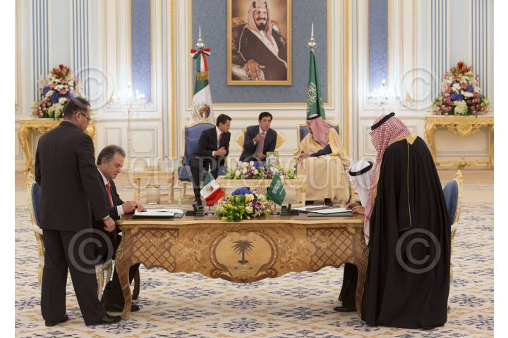 RIAD, ARABIA SAUDITA, 17ENERO2016.- El Presidente de México, Enrique Peña Nieto y el Custodio de las Dos Santas Mezquitas Rey Salman Bin Abdulaziz Al-Saud, Rey de Arabia Saudita, atestiguaron la firma de documentos entre ambas naciones, en el Salón Principal del Palacio de la Corte Real, en el marco de la Visita de Estado que realiza a este país. FOTO: PRESIDENCIA /CUARTOSCURO.COM