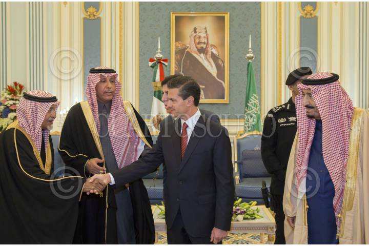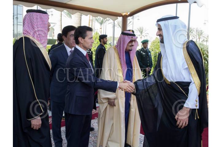 REINO DE ARABIA SAUDITA, 16ENERO2016.- esta noche a la Base Aérea Rey Salman, en la Ciudad de Riad, para realizar una Visita de Estado a esta Nación. Fue recibido por Su Alteza Real el Príncipe Faisal bin Bandar, Gobernador de la Provincia de Riad; Ibrahim al-Sultan, Alcalde de la Ciudad de Riad; Majidbin Abdullah Al-Qasabi, Ministro de Asuntos Sociales y el General Khaled Al-Rodan, encargado de la Base Aérea Rey Salman. Por México fue recibido por Arturo Trejo Nava, Embajador de México en Arabia Saudita; Carlos de Icaza, Subsecretario de Relaciones Exteriores y el Coronel Francisco Javier Zubia González, Agregado Militar y Aéreo en la Embajada de México en Arabia Saudita. FOTO: PRESIDENCIA /CUARTOSCURO.COM