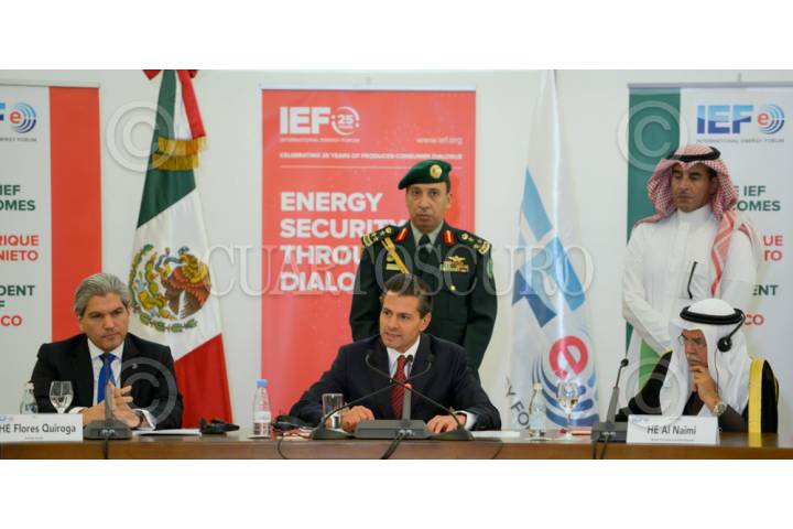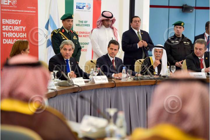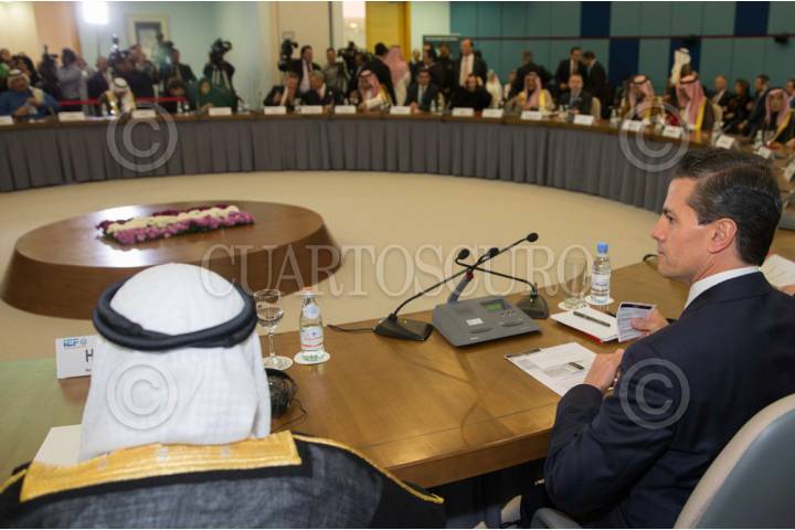 RIAD, ARABIA SAUDITA, 17ENERO2016.- El Presidente de México, Enrique Peña Nieto, participó en el Foro Bilateral de Negocios en donde aseguró que en la Visita de Estado que inicia hoy a Arabia Saudita “habremos de firmar distintos acuerdos para ampliar la cooperación entre nuestros países, pero sobre todo para encontrar mayores oportunidades de acercamiento y de relación económica en campos como el energético, infraestructura y comercio, en los que, sin duda, ambos países tenemos mayor potencial”. FOTO: PRESIDENCIA /CUARTOSCURO.COM