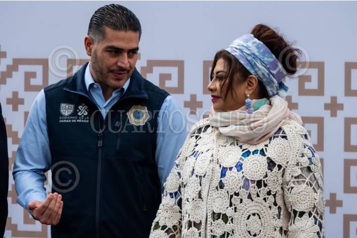 Mirriam Urzúa y Rigoberto Salgado conversan durante la conferencia de seguridad del jefe de gobienro Martí Batres en la alcaldía Tláhuac.