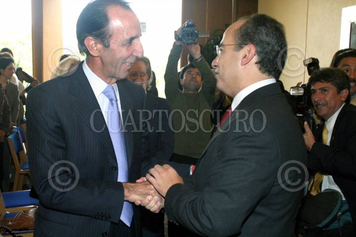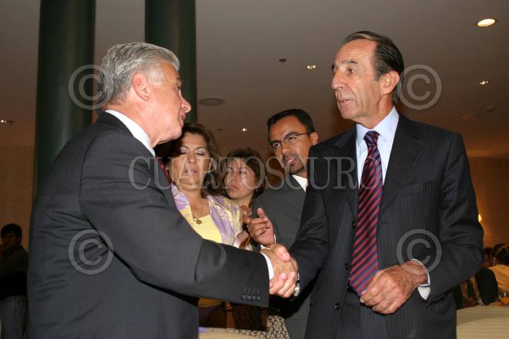 MEXICO, D.F., 18ABRIL2006.- Demetrio Sodi, candidato a la Jefatura de Gobierno del DF por el PAN y Manuel Arango, empresario, durante el arranque de la campaña del panista en un hotel de la centro histórico. FOTO: Moisés Pablo/CUARTOSCURO.COM