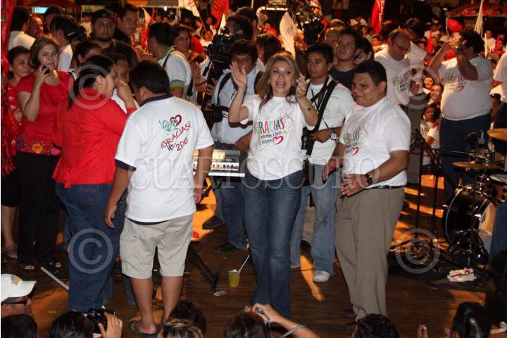 MERIDA, YUCATAN, 17MAYO2010.- Angélica Araujo Lara, Candidata del PRI-PVEM a la alcaldía de esta capital, festejo en el monumento a la patria con cientos de simpatizantes. FOTO: FRANCISCO BALDERAS/CUARTOSCURO.COM