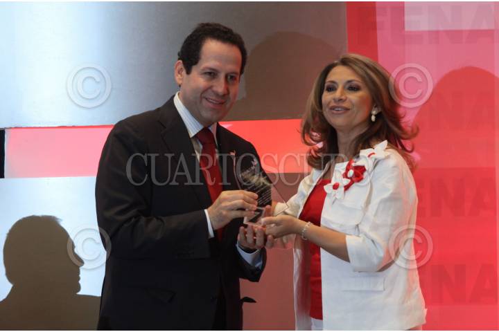 MÉXICO, D.F., 06MAYO2011.- Eruviel Ávila, pre-candidato a la gubernatura del Estado de México, recibió un reconocimiento por su labor al frente de la Federación Nacional de Municipios de México AC (FENAMM), de manos de la nueva presidente Angelica Araujo, en el marco de la ceremonia de la toma de protesta del nuevo consejo directivo. FOTO: MOISÉS PABLO/CUARTOSCURO.COM