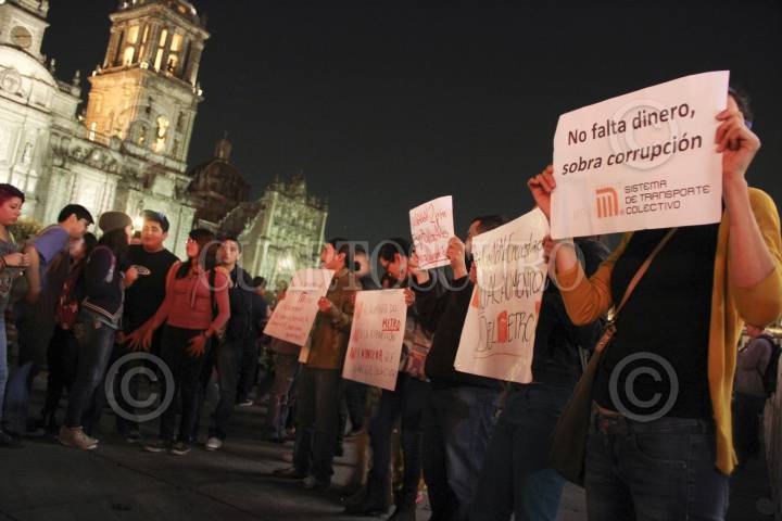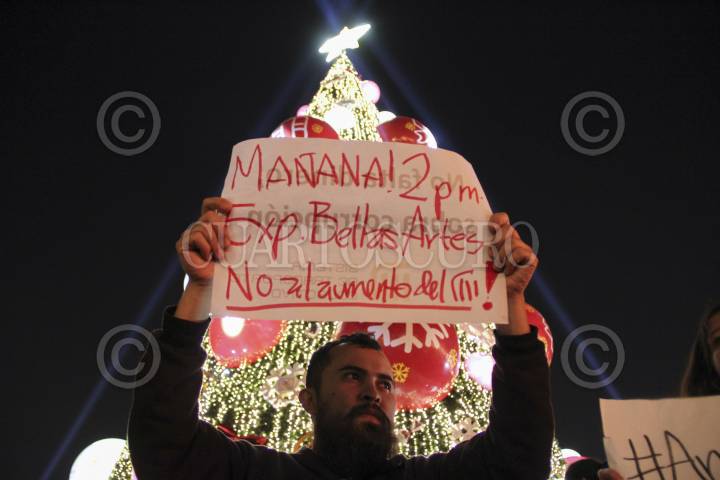 MÉXICO, D.F., 06DICIEMBRE2013.- Estudiantes y personas en lo individual, se manifestaron al pie del árbol navideño en el Zócalo, en contra de próximo aumento en la tarifa del Metro, invitando a la ciudadanía a manifestarse en contra de la decisión del gobierno Miguel Ángel Mancera. FOTO: ADOLFO VLADIMIR /CUARTOSCURO.COM