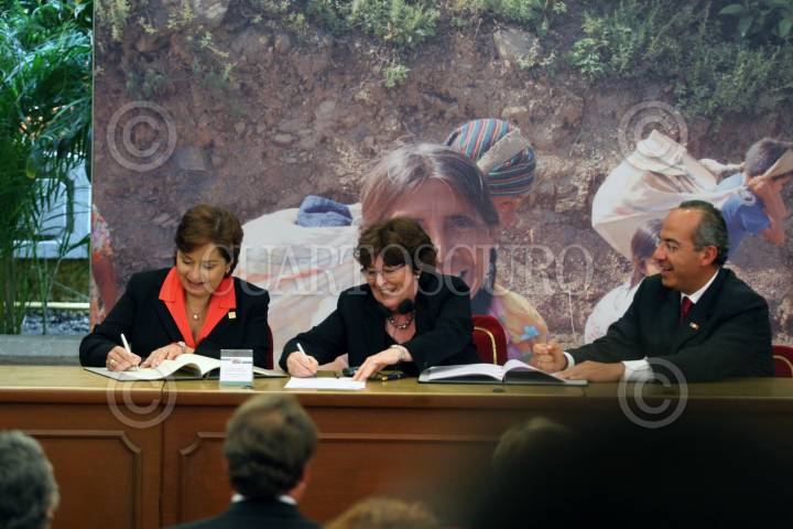 MÉXICO D.F. 06FEBRERO2008.-Se llevo acabo la firma del convenio de cooperación entre la ONU y la Secretaría de Relaciones Exteriores, en la residencia oficial de Los Pinos.En la imagen, Patricia Espinosa, titulara de la Secretaría de Relaciones Exteriores, Louis Arbour, Alta Comisionada de la ONU para los Derechos Humanos y el presidente Felipe Calderón Hinojosa. FOTO: GUILLERMO PEREA/CUARTOSCURO.COM