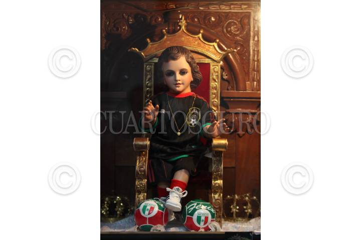 MÉXICO, D.F., 09JUNIO2010.- El Santo Niño de los Milagros ubicado en la Iglesia de San Miguel Arcángel es conocido como el Santo Niño del Fútbol y desde los últimos días ya viste la camisa de color negro, el mismo atuendo que el Tri lucirá el próximo viernes, durante la inauguración del Mundial Sudáfrica 2010. FOTO: RODOLFO ANGULO/CUARTOSCURO.COM