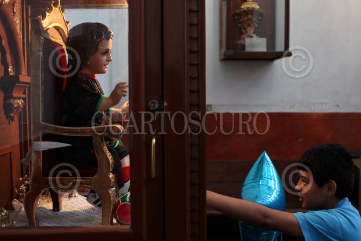 MÉXICO, D.F., 09JUNIO2010.- El Santo Niño de los Milagros ubicado en la Iglesia de San Miguel Arcángel es conocido como el Santo Niño del Fútbol y desde los últimos días ya viste la camisa de color negro, el mismo atuendo que el Tri lucirá el próximo viernes, durante la inauguración del Mundial Sudáfrica 2010 y donde fieles devotos, niños y adultos aficionados al fútbol se encomiendan para que la Selección Mexicana gane los partidos del Mundial. FOTO: RODOLFO ANGULO/CUARTOSCURO.COM