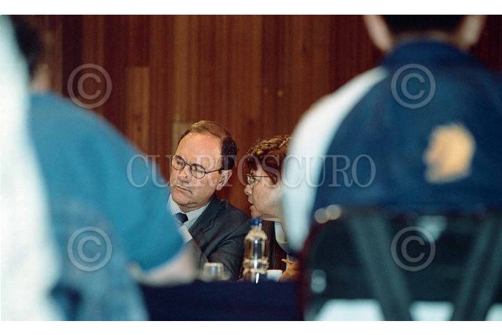 Enrique del Val y Arcelia Quintana autoridades universitarias durante la mesa de negociación con los representantes del CGH en el Auditorio Alfonso caso de Humanidades.