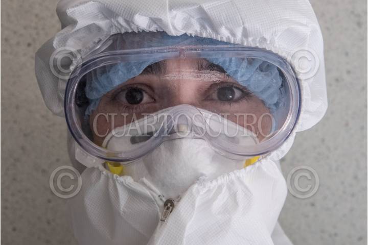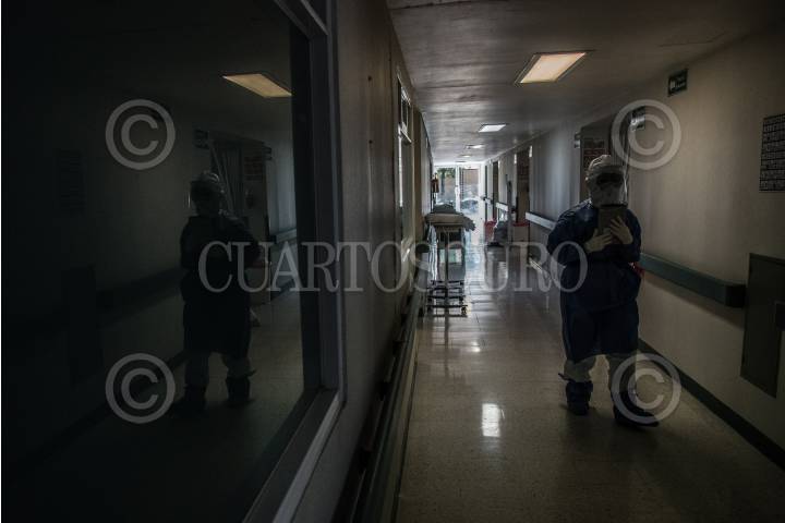 Reflejo de una doctora mientras camina en los pasillos del área de atención covid-19 del Hospital General de Atizapán.