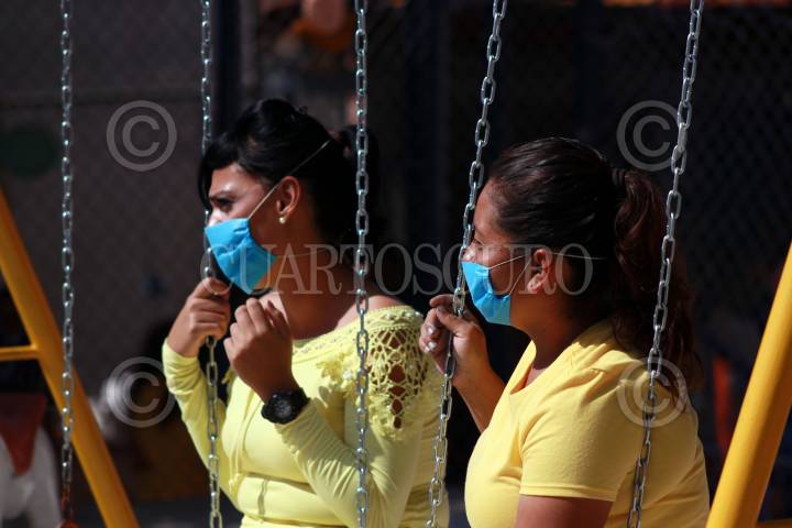 Dos reclusas del penal femenil de Atlacholoaya se mecen en un columpio en un área infantil que se habilito para sus hijos.