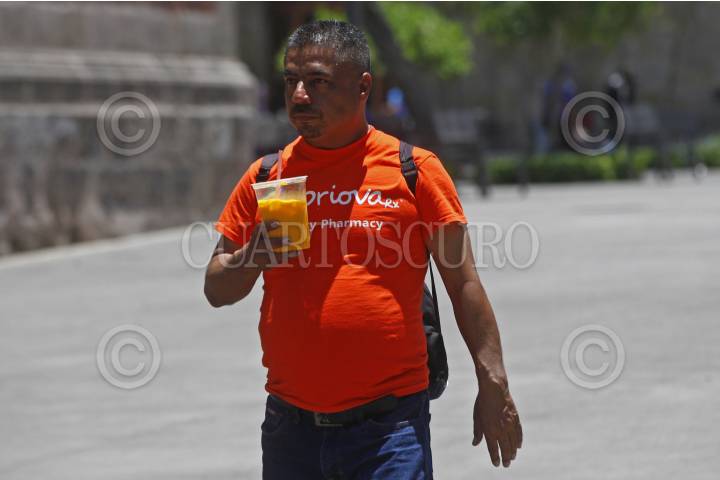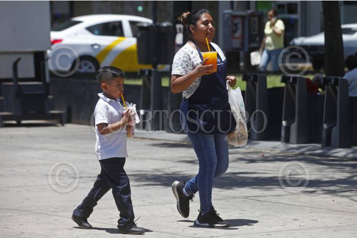 Dos hombres caminan por un andador ubicado en el centro de la ciudad con sus bebidas refrescantes, esto para mitigar la sed que ocasiona el calor.