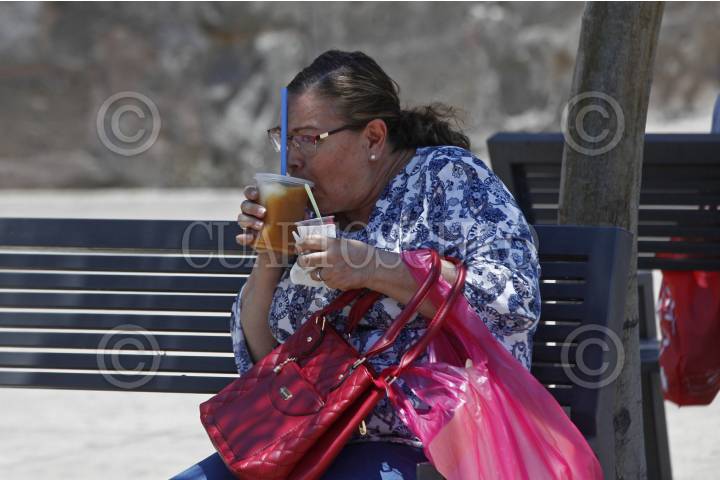 Una mujer adulta bebe bebidas refrescantes, ya que las altas temperaturas incrementan constantemente.