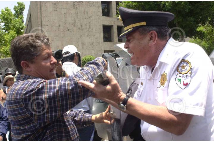 Francisco Arellano Noblecia, comandante de la PFP, discute con un maestro de la CNTE luego de impedir el acceso a una comisión que entregaría sus demandas al titular de Gobernación, Santiago Creel. FOTO: Juan Pablo Zamora/CUARTOSCURO.COM