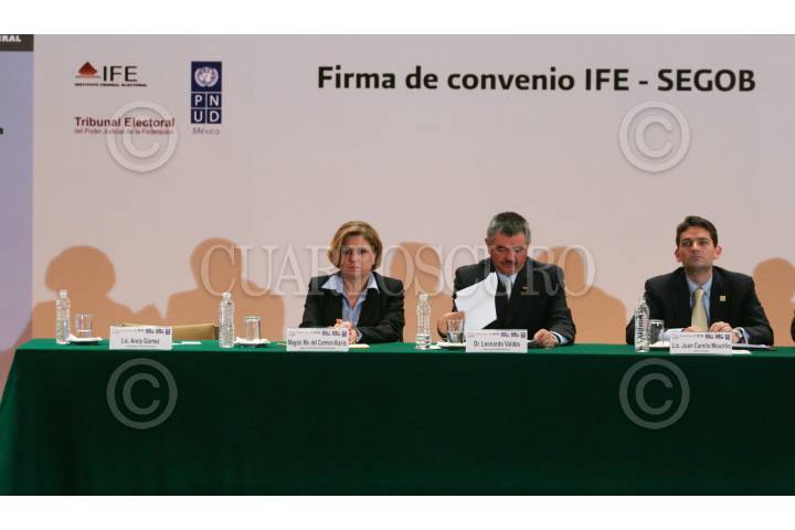 MÉXICO, D.F., 30OCTUBRE2008.- Arely Gómez, titular de la FEPADE, Leonardo Váldez, ministro presidente del Instituto Federal Electoral y Juan Camilo Mouriño, Secretario de Gobernación, Secretario de Gobernación, encabezaron la firma del Convenio del Fondo de Apoyo para la Observación Electoral 2008-2009, que se realizó en el Museo de Antropología. FOTO: MOISÉS PABLO/CUARTOSCURO.COM