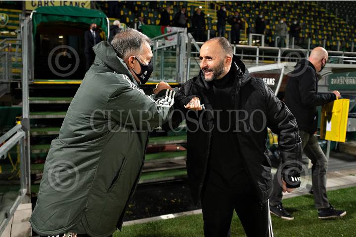 El director técnico de Mexico, Gerardo "Tata" Martino, saluda Djamel Belmadi, director técnico de Argelia.
