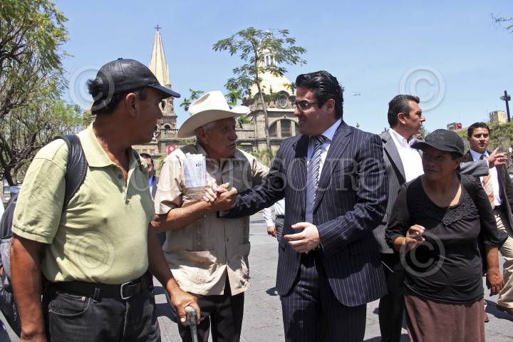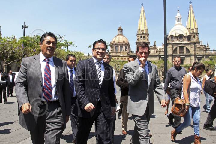 GUADALAJARA, JALISCO., 22ABRIL2013.- Hoy al medio día el Gobernador del Estado, Jorge Aristóteles Sandoval, se dirigió pie tierra desde Palacio de Gobierno la Secretaria del Trabajo, e iba acompañado por el Presidente del Congreso del Estado, Miguel Castro y el Presidente del Ayuntamiento de Guadalajara, Ramiro Hernández. FOTO: FERNANDO CARRANZA /CUARTOSCURO.COM