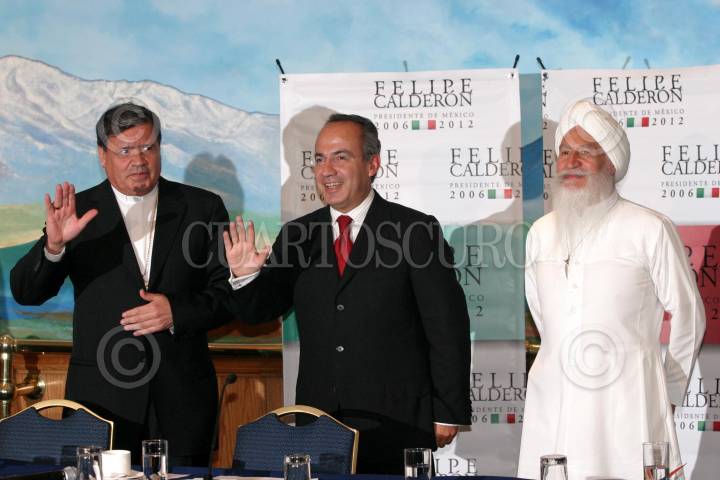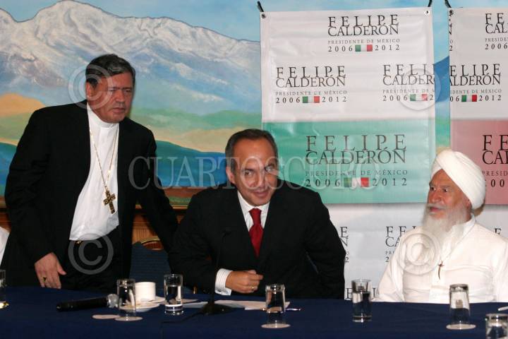 MEXICO, D.F., 17JULIO2006.- Norberto Rivera, Cardenal Primado de México, Felipe Calderòn Hinojosa, candidato a la presidencia de la Repùblica por el PAN y el ministro Arjan Singhs, durante una reuniòn del panista con el Consejo Interreligioso en un hotel de la zona de Polanco. FOTO: Moisés Pablo/CUARTOSCURO.COM