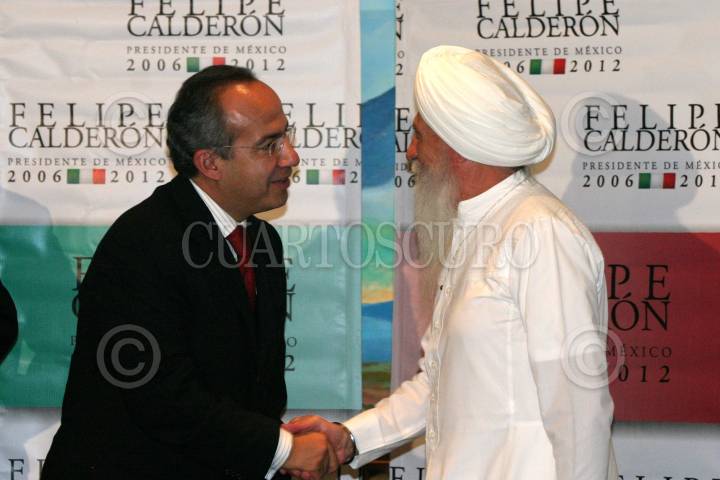 MEXICO, D.F., 17JULIO2006.- Felipe Calderòn Hinojosa, candidato a la presidencia de la Repùblica por el PAN y el ministro Arjan Singhs, durante una reuniòn del panista con el Consejo Interreligioso, en un hotel de la zona de Polanco. FOTO: Moisés Pablo/CUARTOSCURO.COM