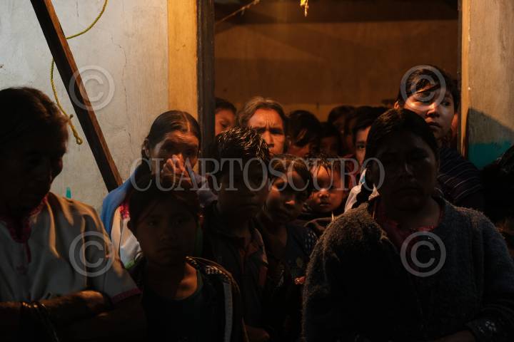 Mujeres y niños reunidos en uno de los puntos de seguridad designado por las propias comunidades en el pueblo de Coco, Aldama.
