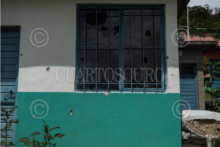 Vista de una de las casas con mayor número de impactos de balas en la comunidad de Coco, Aldama.