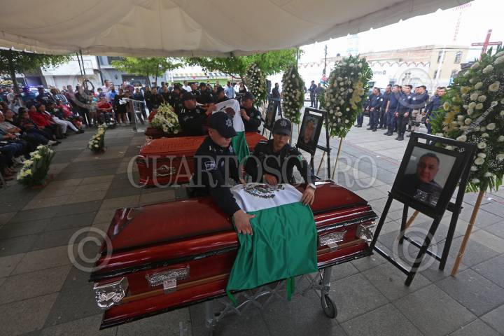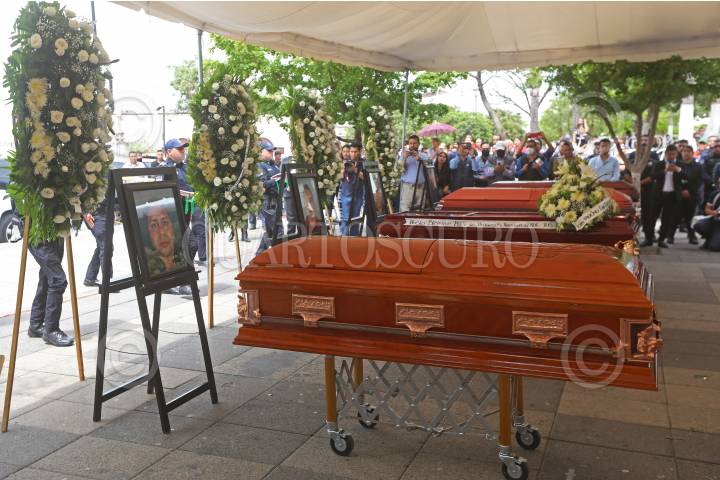 Los féretros donde se encuentran los cuerpos del comandante Arturo Coronado Díaz y los oficiales Rogelio Emanuel González Bucio, Daniel Vargas Magdaleno y Ángel Reyes, hoy al rendirles homenaje en la Plaza Benito Juárez, en el municipio del Salto.