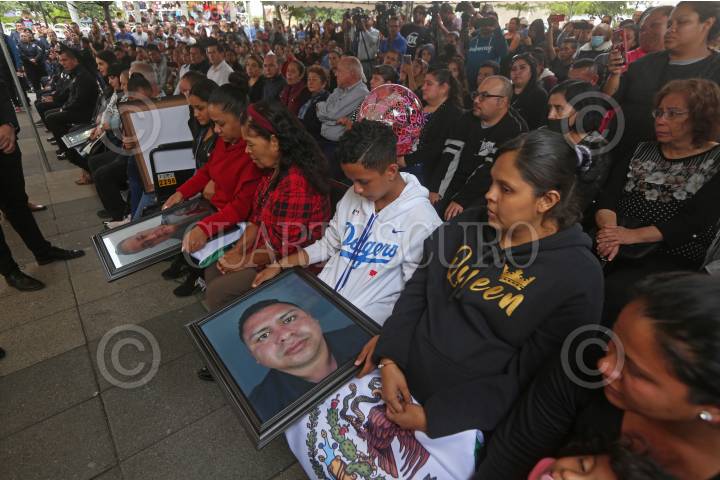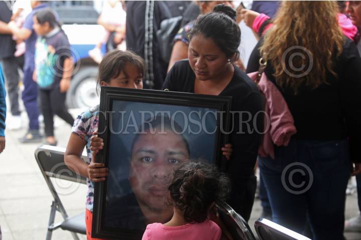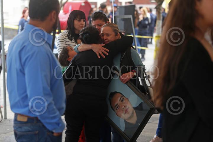 Familiares del comandante Arturo Coronado Díaz y los oficiales Rogelio Emanuel González Bucio, Daniel Vargas Magdaleno y Ángel Reyes, hoy durante el homenaje de cuerpo presente en la Plaza Benito Juárez, en el municipio del Salto.