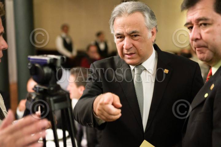 CIUDAD DE MÉXICO, 16FEBRERO2017.- Miguel Ángel Mancera, Jefe de Gobierno, saluda al nuevo secretario de Turismo, Armando López Cárdenas, en la presentación del Sistema de Sustentabilidad Alimentaria de la CDMX, en el Antiguo Palacio del Ayuntamiento. FOTO: MOISÉS PABLO /CUARTOSCURO.COM