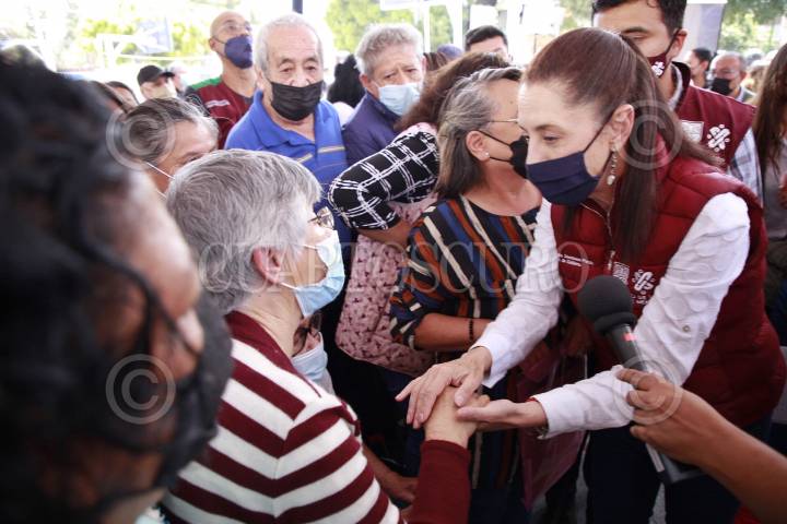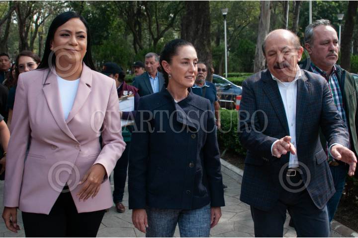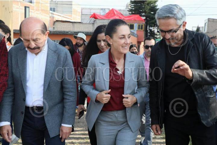 Claudia Sheinbaum, jefa de gobierno de la capital, Ariadna Montiel, secretaria del Bienestar y Armando Quintero, alcalde de Iztacalco, arriban al evento.