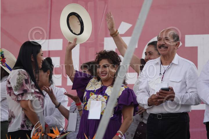 Los alcaldes Clara Brugada y Armando Quintero de Iztapalapa e Iztacalco respectivamente, durante la Asamblea de Morena para promover el voto de los ciudadanos el próximo 10 de abril para la revocación de mandato de Andrés Manuel López Obrador, presidente de México