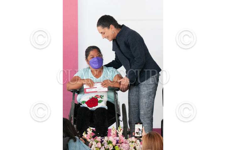 Claudia Sheinbaum, jefa de gobierno de la capital, hace entrega de una tarjeta del bienestar.