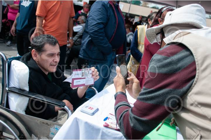 Los servidores de la nación toman fotografías a las personas que son beneficiadas con la tarjeta del bienestar.