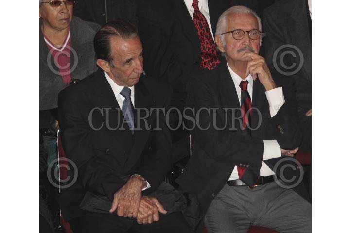 MÉXICO, D.F., 09ENERO2012.- Manuel Arango y Carlos Fuentes, durante el homenaje póstumo a Pedro Armendariz en el Palacio de Bellas Artes. FOTO: SAÙL LÒPEZ/CUARTOSCURO.COM