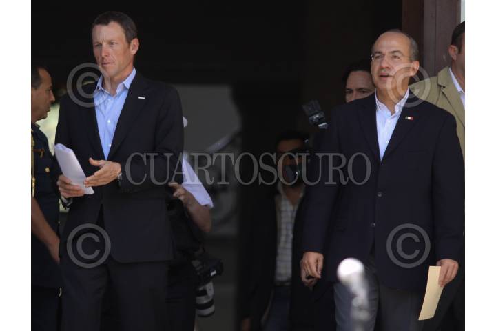 MÉXICO, D.F., 28FEBRERO2009.- El ciclista Lance Armstrong acompañado por Felipe Calderón Presidente de México a su llegada a las escalinatas de la residencia oficial de los pinos en donde ambos dieron un mensaje conjunto. FOTO: SÁSHENKA GUTIERREZ/CUARTOSCURO.COM