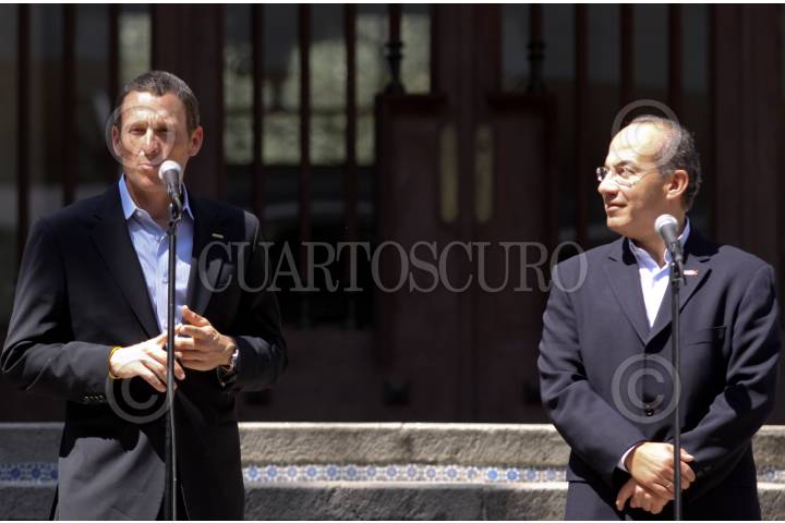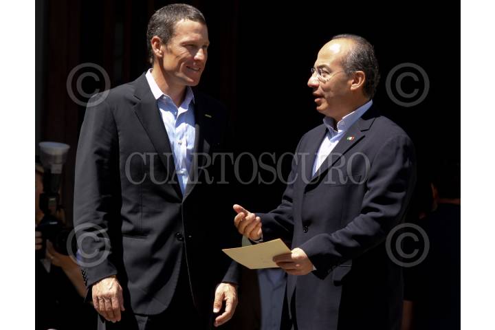 MÉXICO, D.F., 28FEBRERO2009.- El ciclista Lance Armstrong acompañado por Felipe Calderón Presidente de México, en las escalinatas de la residencia oficial de los pinos en donde ambos dieron un mensaje conjunto. FOTO: SÁSHENKA GUTIERREZ/CUARTOSCURO.COM