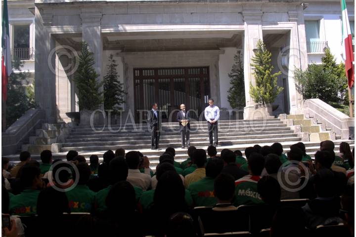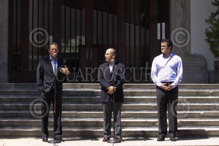 MÉXICO, D.F., 28FEBRERO2009.- El ciclista Lance Armstrong acompañado por Felipe Calderón Presidente de México y Carlos Hermosillo director de la CONADE en las escalinatas de la residencia oficial de los pinos en donde ambos dieron un mensaje conjunto. FOTO: SÁSHENKA GUTIERREZ/CUARTOSCURO.COM
