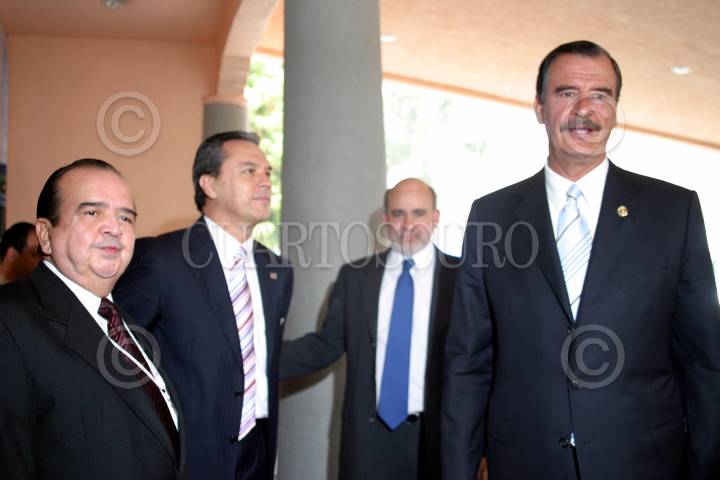 MEXICO, D.F. 30MAYO2005.- León Arnulfo Flores González, presidente de la Cámara Nacional de Autotransportes de carga, presidente electo de la CANACAR, Tirson Martínez, Eduardo Sojo, encargado de la oficina de Politicas Públicas de la Presidencia y el primer mandatario Vicente Fox, a su llegada a la comida de toma de protesta del consejo nacional 2005-2006 de dicha organización. FOTO: Sandra Perdomo/CUARTOSCURO.COM