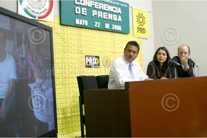 MÈXICO,D.F.22Mayo2006.- Arnulfo Montes, representante legal de la Organizaciòn Civil FENPA y los Diputados Federales del PRD: Beatriz Mujica e Inti Muñoz durante la conferencia de prensa en donde presentaron un video como evidencia de ciertas anomalìas por desvìo de recursos. Al mismo tiempo piden a la SEDESOL aclarar y explicar ciertos actos que segùn es el Gobierno Federal quien està destinando los recursos en beneficio del candidato a la presidencia de la Repùblica: Felipe Calderòn y exigen que la comisiòn permanente investigue tales irregularidades. FOTO: M. Tulia Pèrez Bocanegra/CUARTOSCURO.COM