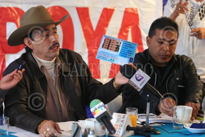 MÉXICO, D.F., 26JUNIO2009.- Arnulfo Reyes, líder del Frente Popular Francisco Villa y Carlos Coronado, durante conferencia de prensa donde llamaron a los capialinos realizar su voto en blanco, ademas amenazaron a el gobierno capitalino con tomar las instalaciones del INVI ya que segun Arnulfo es una dependencia inútil que vende las casas del pueblo a compañías constructoras como DeMet. FOTO: RICARDO CASTELAN/CUARTOSCURO.COM