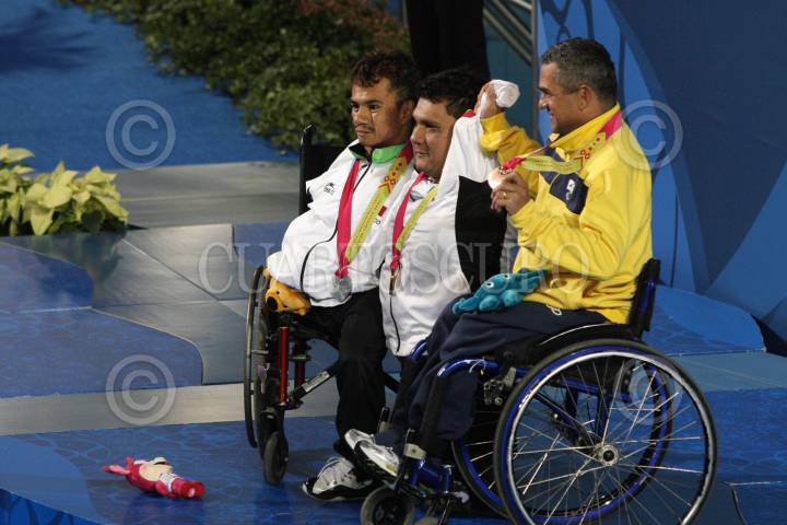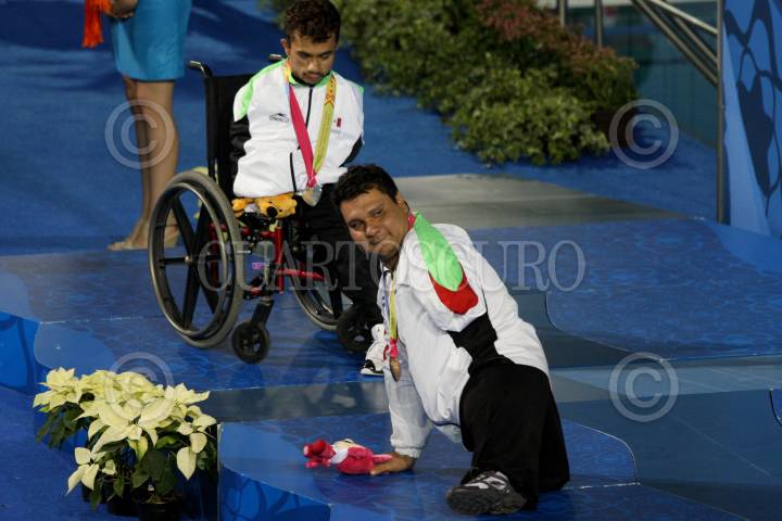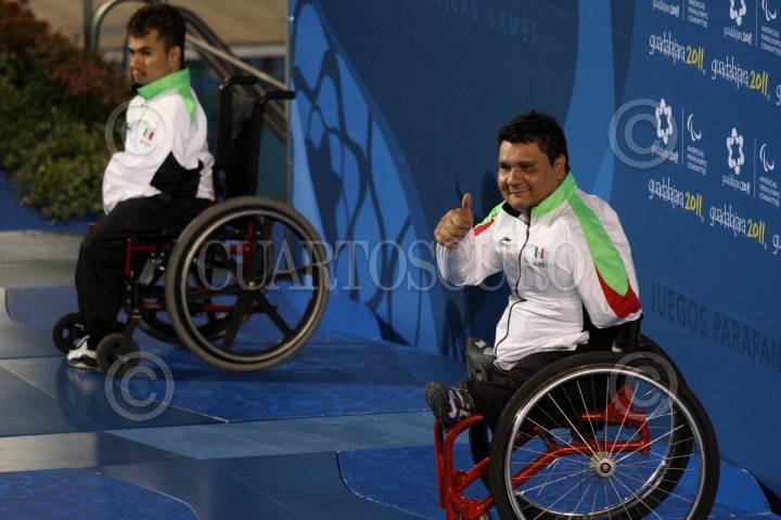 ZAPOPAN, JALISCO, 16NOVIEMBRE2011.- El mexicano Arnulfo Castorena consiguió la medalla de oro en la final de los 50 metros pecho varonil SB2, prueba en la que logro romper el récord Parapanamericano con un tiempo de 58.44 segundos, en la misma competencia Cristopher Tronco logro la presea de plata. FOTO: FERNANDO CARRANZA GARCÍA/CUARTOSCURO.COM