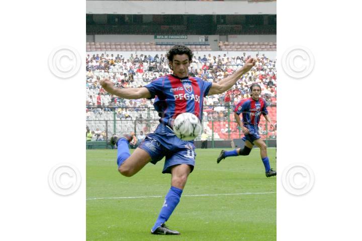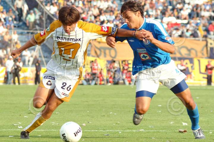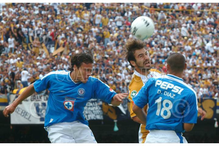 MÉXICO, D.F. 06JUNIO2004.- Joaquín Beltrán (Pumas) disputa un balón entre Arón Galindo (Cruz Azul) y Daniel Díaz (Cruz Azul) en la semifinal del torneo de clausura 2004 en donde los Pumas vencieron a Cruz Azul con un marcador global de 3 goles a 2. FOTO: Iván Stephens/CUARTOSCURO.COM