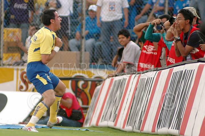 MÉXICO, D.F. 15ABRIL2006.- Aarón Padilla festeja el segundo gol de equipo en el partido de la continuación de la jornada 15 del torneo de clausura 2006 en el que las Águilas del América vencieron 3 goles a 1 a la máquina celeste de la Cruz Azul en el estadio Azul. FOTO: Iván Stephens/CUARTOSCURO.COM