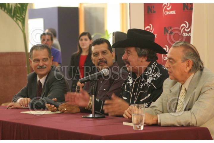 MONTERREY, NUEVO LEON 7 SEPTIEMBRE 2006.- Julián Garza Arredondo, mejor conocido en el medio artístico norteño como El Viejo Paulino presento noche el libro de corridos y canciones populares del noreste de México. Guillermo Berrones recopilo en varios años de trabajo más de 170 composiciones que han interpretado Los Cadetes de Linares, Chelo Silva, Carlos y José entre otros. En la mesa estuvieron el doctor Víctor Zuñiga, Guillermo Berrones, Julián Garza Arredondo y Romero Flores Caballero director de CONARTE del estado. FOTO: PEDRO VALTIERRA/CUARTOSCURO.COM