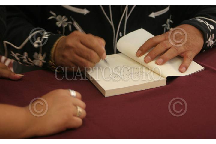 MONTERREY, NUEVO LEON 7 SEPTIEMBRE 2006.- Julián Garza Arredondo, mejor conocido en el medio artístico norteño como El Viejo Paulino presento noche el libro de corridos y canciones populares del noreste de México. Guillermo Berrones recopilo en varios años de trabajo más de 170 composiciones que han interpretado Los Cadetes de Linares, Chelo Silva, Carlos y José entre otros. En la mesa estuvieron el doctor Víctor Zuñiga, Guillermo Berrones, Julián Garza Arredondo y Romero Flores Caballero director de CONARTE del estado. Decenas de personas hicieron fila para que les firmara su libro. FOTO: PEDRO VALTIERRA/CUARTOSCURO.COM
