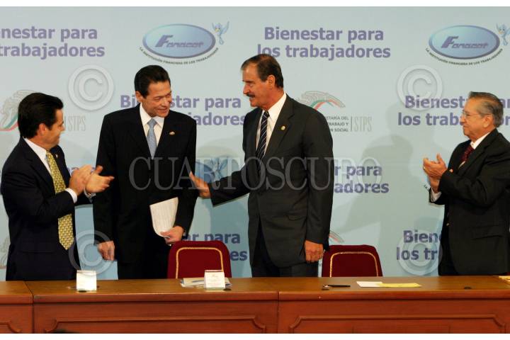 MEXICO, D.F. 18JULIO2005.- El Gobernador de Sonora, Eduardo Bours, Arsenio Díaz, director del FONACOT, el presidente Vicente Fox y el secretario del trabajo Xavier Salazar Sáenz durante la ceremonia Acciones del Fonacot. FOTO: Miguel Dimayuga/CUARTOSCURO.COM