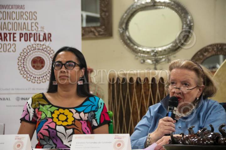 Lanzamiento de la convocatoria de concursos nacionales de Arte Popular, que realiza el Gobierno Federal a través de la secretaría de Cultura que se llevó acabo en la Fonart de la Colonia Mixcoac. Eva María Ayala y Cándida Fernández en la imagen.