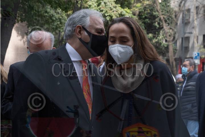 Miguel Torruco, y Gabriela Cámara, observan un ajolote durante la Expo Venta "Arte y Colores de la CDMX".