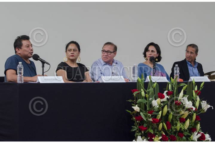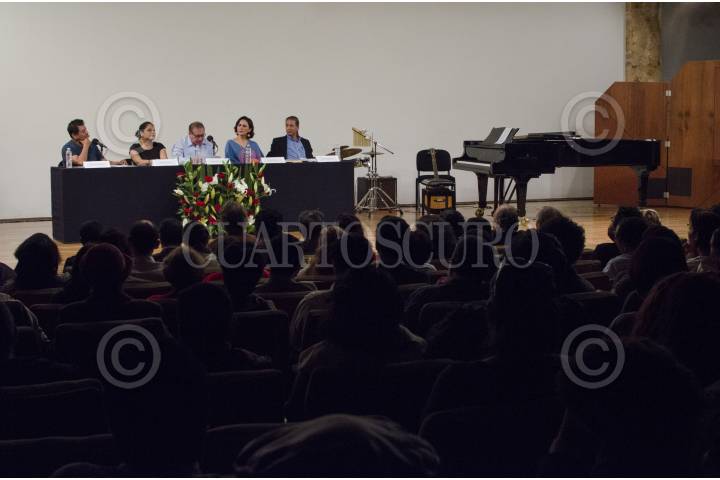 MÉXICO, D.F., 15JULIO2015.- Natalia Toledo, hija de Francisco Toledo, encabezó el homenaje que realizó en Instituto Nacional de Bellas Artes al pintor oaxaqueño, con motivo de su cumpleaños 74, el próximo 17 de julio. El poeta Mardonio Carballo moderó la mesa en donde los participantes recordaron los esfuerzos del artista por mantener y fomentar la cultura en su natal Juchitán. FOTO: MARÍA JOSÉ MARTÍNEZ /CUARTOSCURO.COM