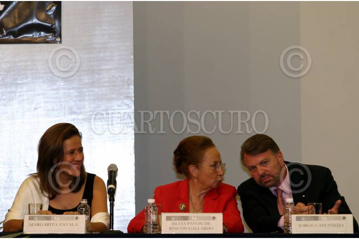 MÉXICO, D.F., 27AGOSTO2009.- Margarita Zavala, esposa del presidente Felipe Calderón; Silvia Pavón de Rincón Gallardo, viuda de Gilberto Rincón Gallardo y Jorge Castañeda durante el homenaje por motivo del primer aniversario luctuoso del político Gilberto Rincón Gallardo que se celebro en la sala Manuel M. Ponce del Palacio de Bellas Artes. FOTO: RODOLFO ANGULO/CUARTOSCURO.COM