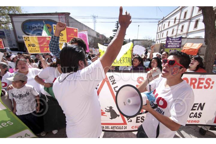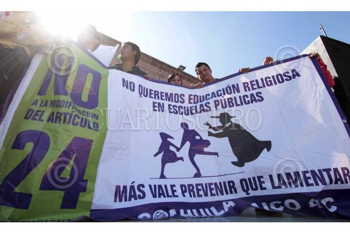 SALTILLO, COAHUILA, 01FEBRERO2012.- Cientos de integrantes de diversas agrupaciones religiosas, ciudadanos e intelectuales se manifestaron de forma pacífica por diversas calles de Saltillo hasta llegar al Congreso del estado de Coahuila, en protesta por la reforma al Artículo 24 de la Constitución Mexicana aprobada en la Cámara de Diputados en diciembre pasado. FOTO: KARLA RUIZ/CUARTOSCURO.COM